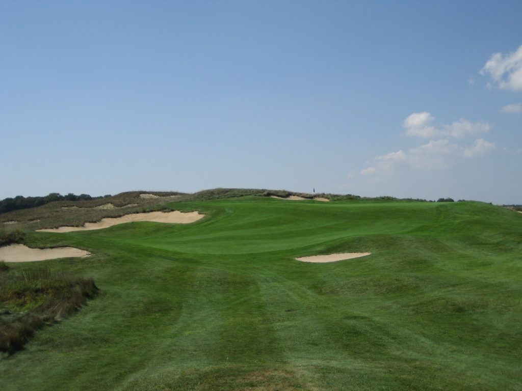 While irregular traps defend the elevated 14th green, the next par-3 ahead at #17 (right) is loosely protected by a scattering of round traps found mostly behind the green, save for a deep pot bunker in front. The closer is Vineyards’ lone 400-yard par-4 (first picture above) — like many of those that came before, it features sand on alternating sides of the fairway. The hole narrows alongside a pond before reaching a thin green secured by no fewer than eight traps.
