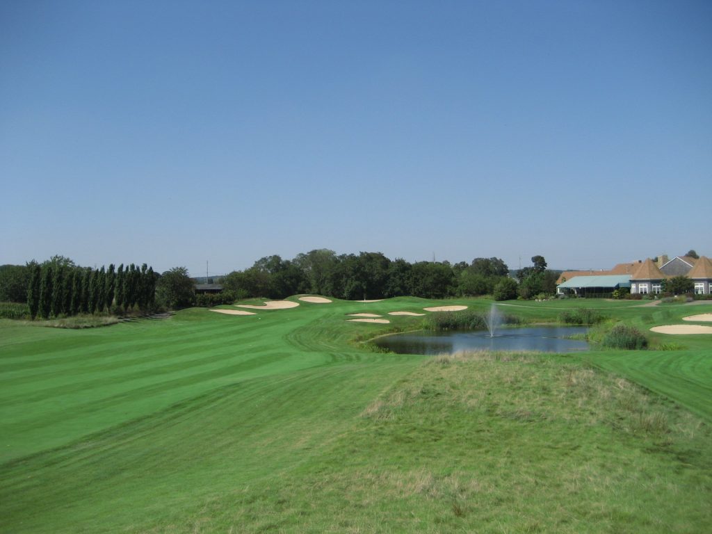 The par-5 eighth brings a little curve back to the course — its fairway drifts left around a trap, then continues past alternating left and right bunkers before stopping at a well-protected green. An accurate, sand-free tee shot brings the green within reach on the second shot. Some might instinctively reach for the driver on #9, a short, downhill par-4, but a bad pull risks a watery conclusion to the front nine. Better to play short and try to get up and down for birdie.