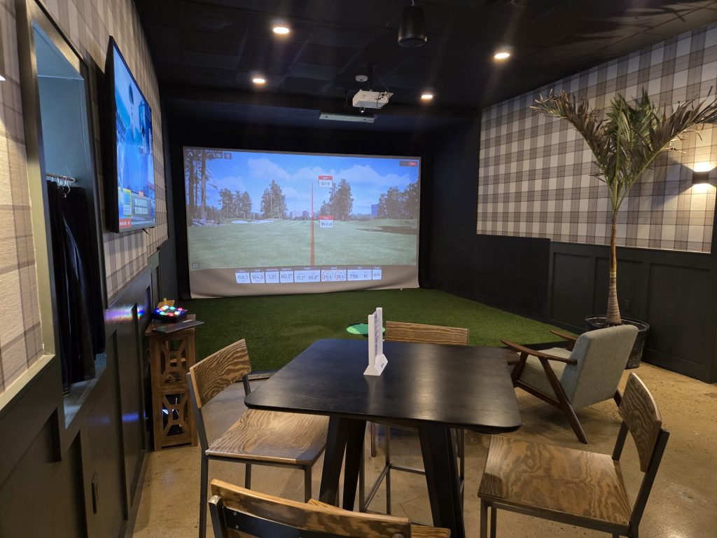 Customers who do pay attention to the golf end of the business will find two back-to-back simulators at the heart of the space, both lined with counter stools within easy reach of the bar. In the back, a more private simulator room offers an environment on par with a stylish club lounge, with a leather couch, padded chairs and plaid wallpaper. The Uneekor sims provide a wealth of swing data and feedback for the hard-core players; for those in a more competitive mood, GSPro software allows for rounds on the thousand-plus user-generated courses in its catalog. There are also options to play target-style and kid-friendly games and challenges.