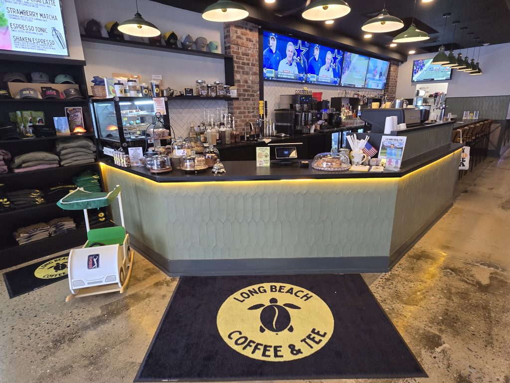 Its location just a block away from the Long Beach train station has made it a dependable stop for neighbors in need of a morning jolt. “We have coffee customers who don’t even know we have golf simulators in here,” says Natalie Arnold, who owns Long Beach Coffee & Tee with her husband Richie and business partner Kevin Hanrahan.