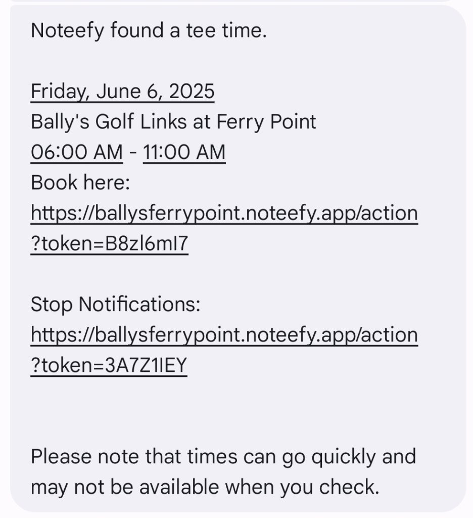 [PICTURED: TOP — Spy Ring #7; BOTTOM — A Noteefy text alert for a peak tee time at Ferry Point in the Bronx. The search range was a Friday morning tee time between 6:00 and 11:00 a.m., a period that is often sold out. Players can follow the link to view or book the tee time.]